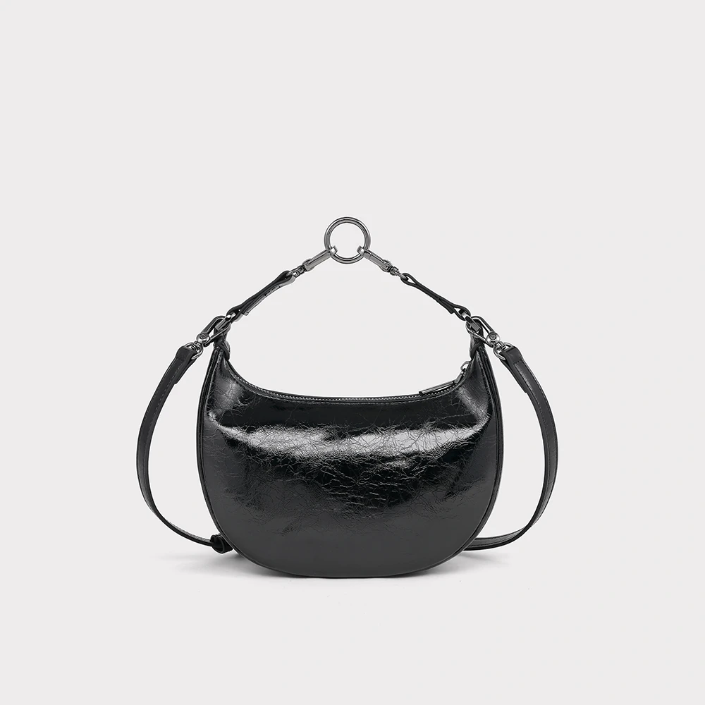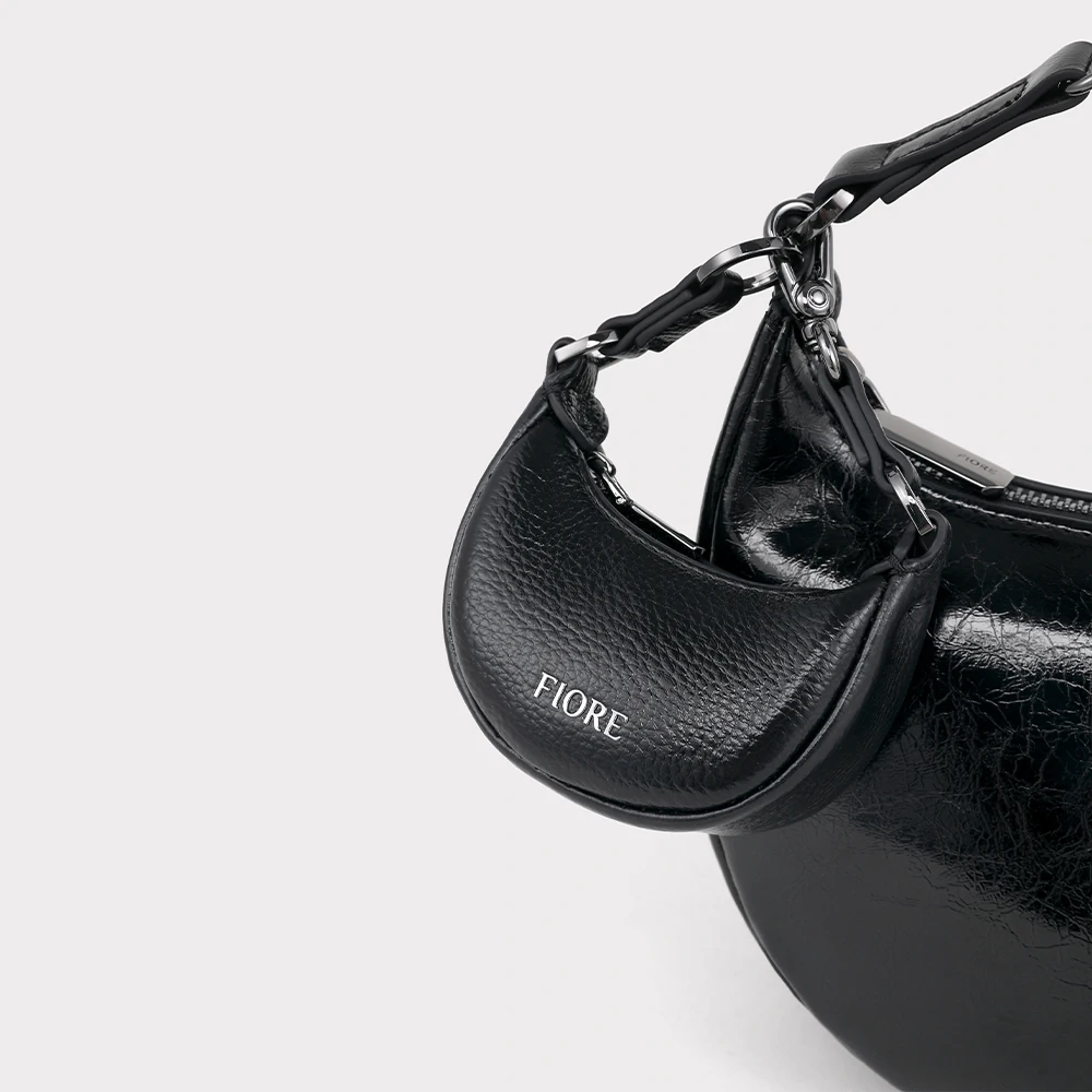 Bolsa Hobo na cor preta, acompanha uma mini bag da mesma cor, com ferragens escuras, alça removível, logo Fiore frontal e dois compartimentos internos.