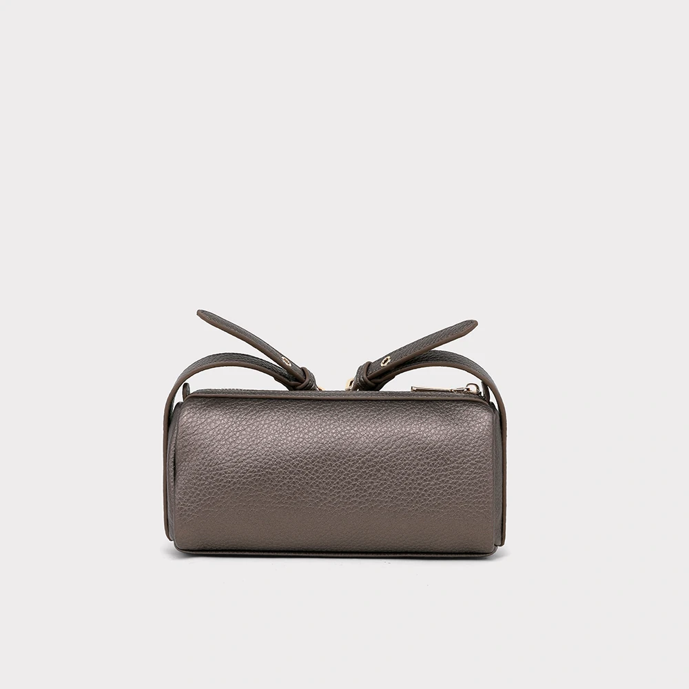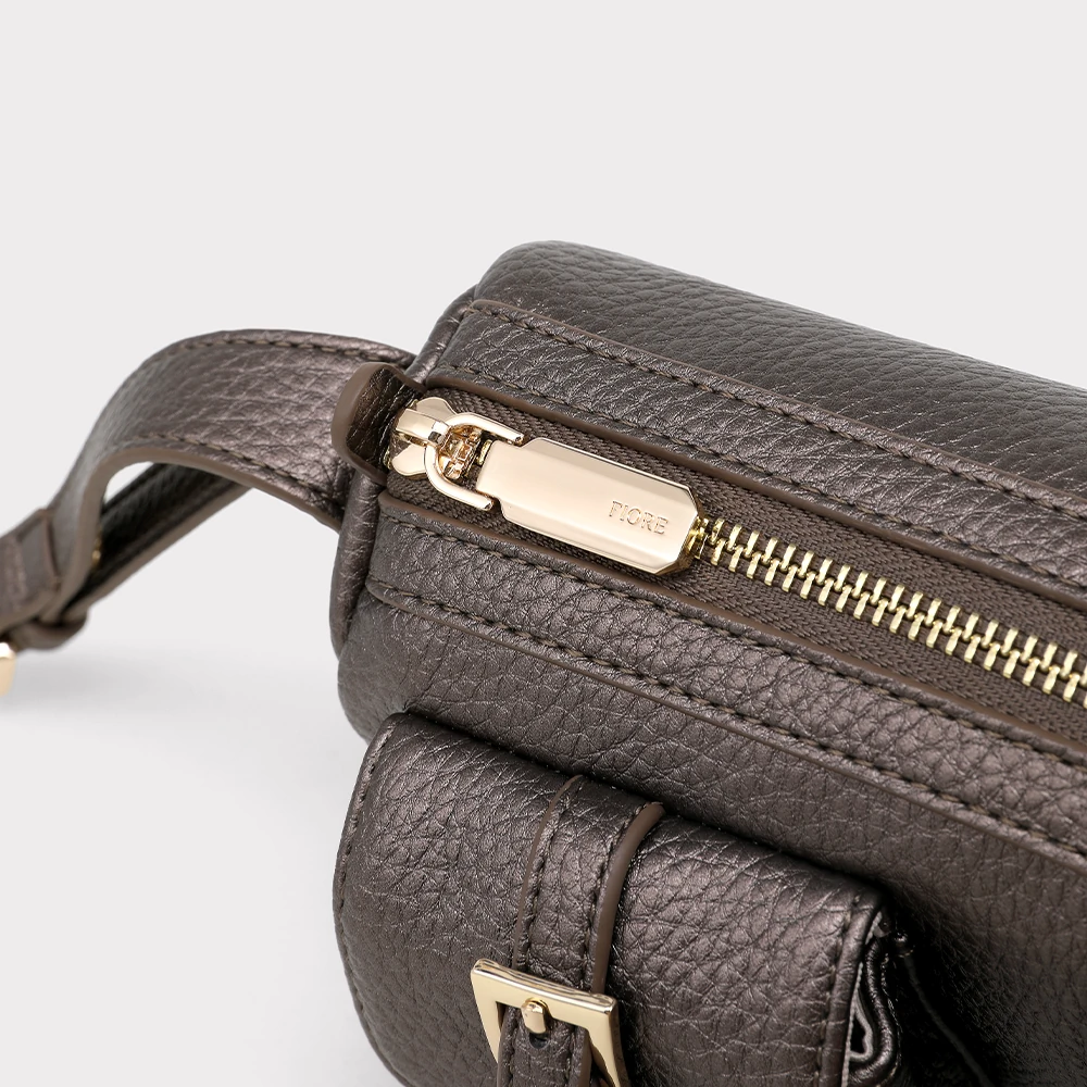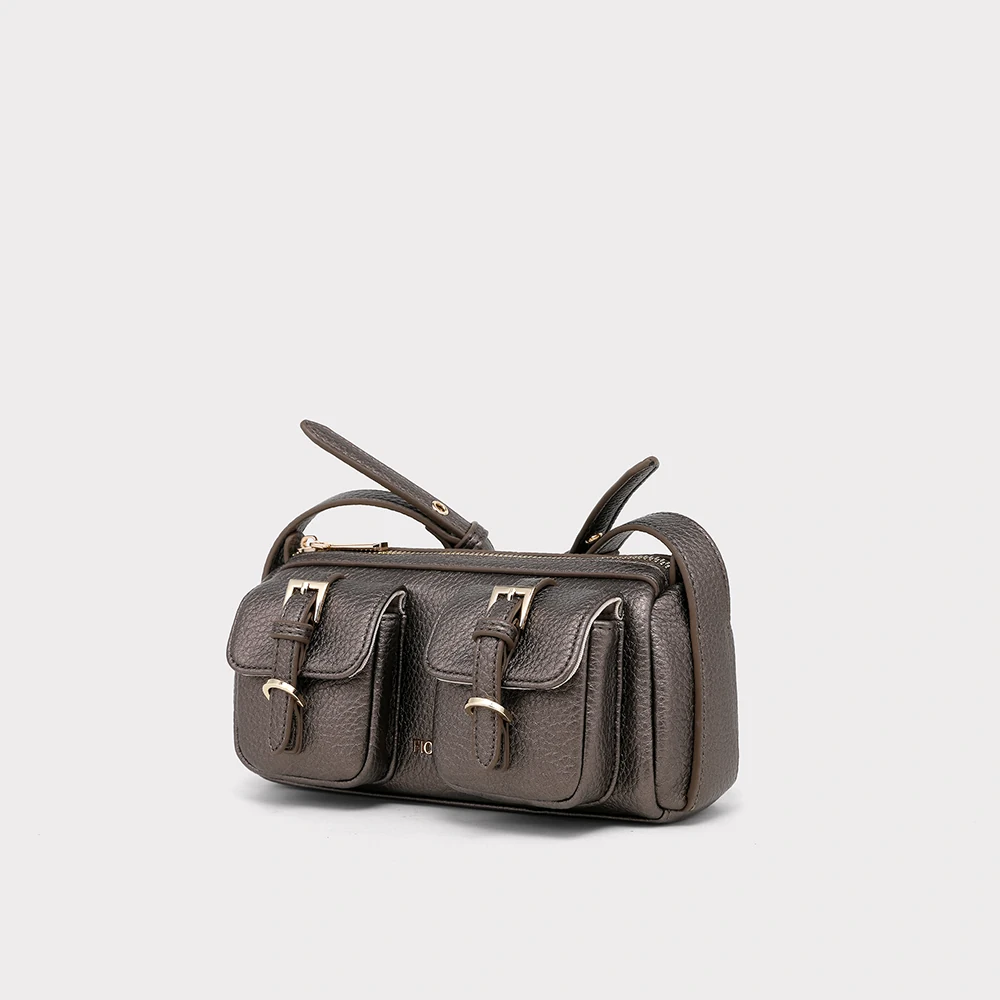 Bolsa na cor bronze em tecido tecnológico, com bolsos externos, fivelas na parte frontal, acompanha alça ajustável, dois compartimentos internos, bolsos externos com detalhe com fivela e logo na parte frontal.