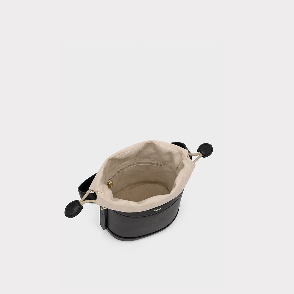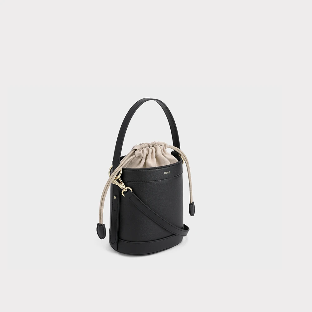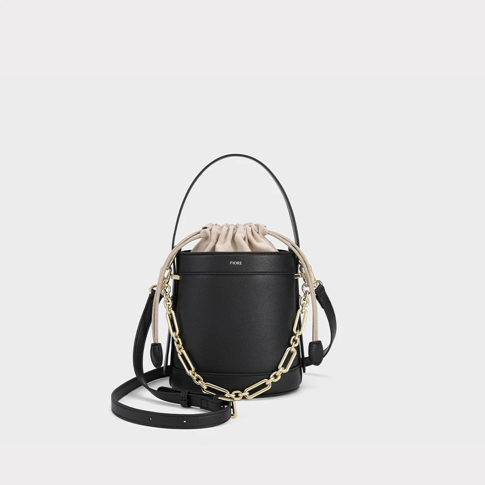 Modelo bucket com design elegante e moderno. Possui fechamento superior com cordão, detalhe em corrente metálica dourada, alça de mão e alça transversal removível, que adicionam sofisticação ao visual. Compacta e versátil, é ideal para complementar produções do dia a dia com estilo.
