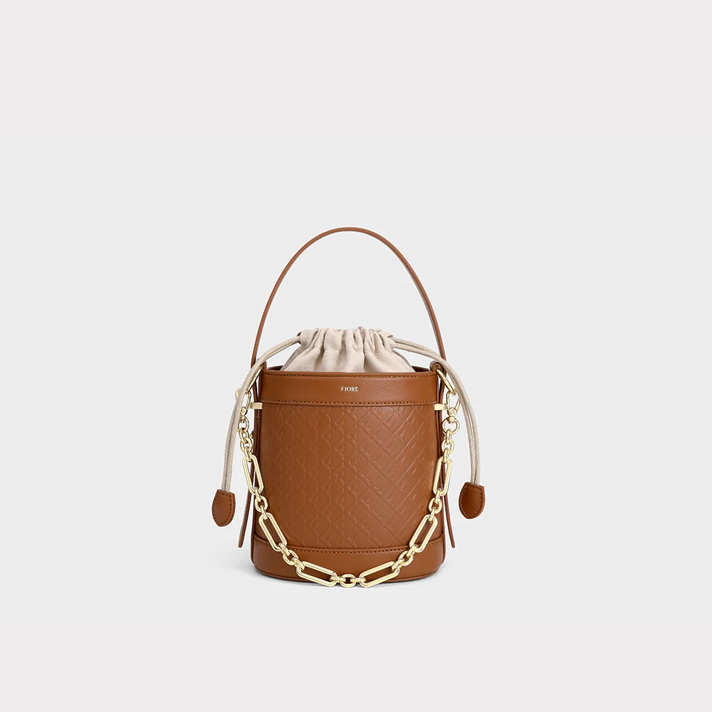 Modelo bucket com design elegante e moderno. Possui fechamento superior com cordão, detalhe em corrente metálica dourada, alça de mão e alça transversal removível, que adicionam sofisticação ao visual. Compacta e versátil, é ideal para complementar produções do dia a dia com estilo.
