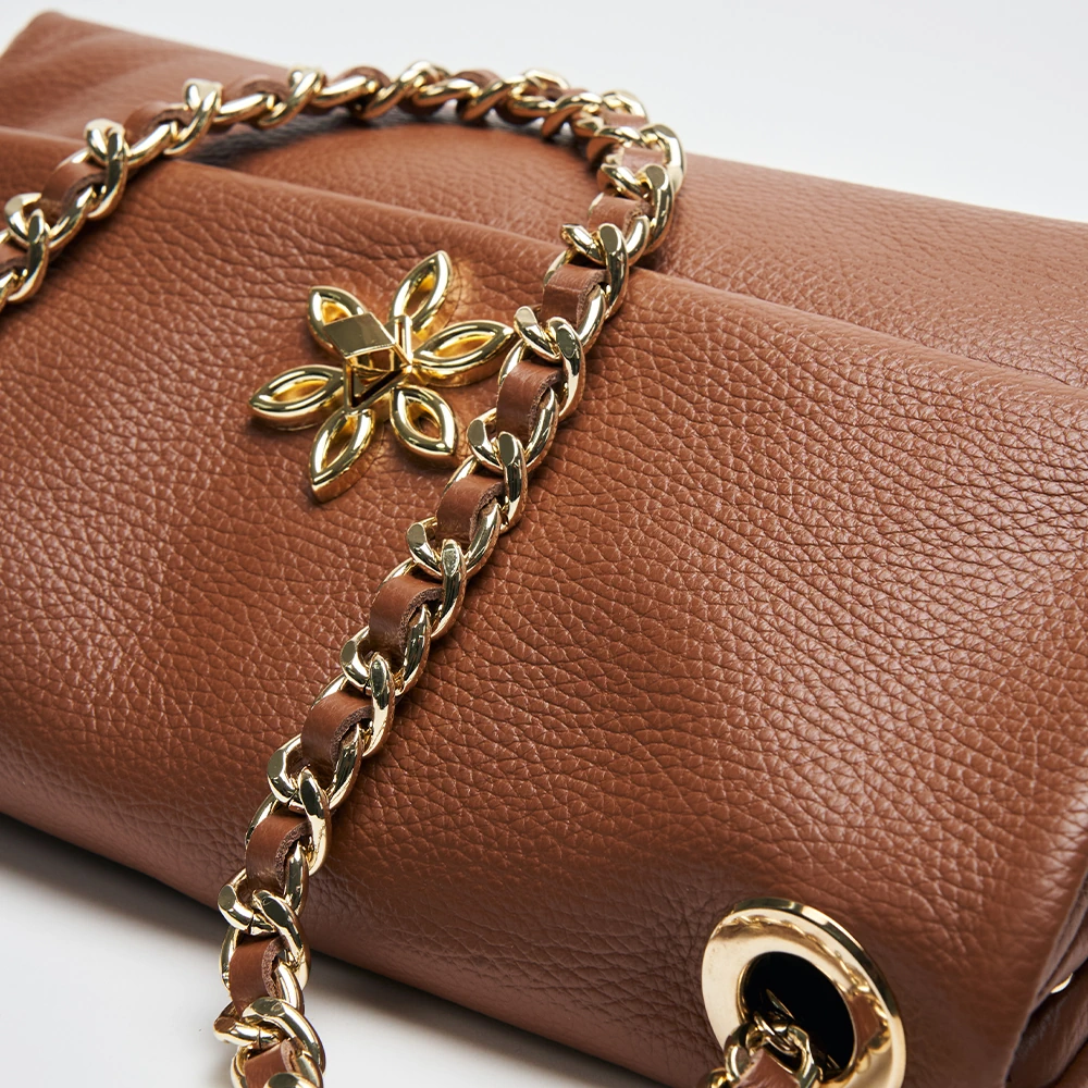 Confeccionada em couro legítimo italiano com acabamento levemente texturizado, ela é feita artesanalmente em Firenze. Seu fecho frontal com aplique floral Fiore dourado remete à feminilidade clássica italiana, enquanto a alça com corrente dourada entrelaçada em couro confere sofisticação e um toque de joia.