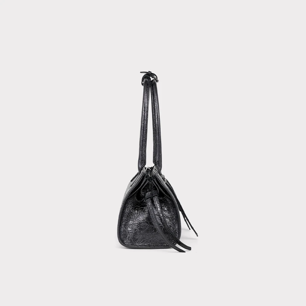 Bolsa baguette na cor preta, estruturada, com alças de mão rígidas, dois compartimentos internos, alça transversal removível, detalhes na alça frontal e lateral.