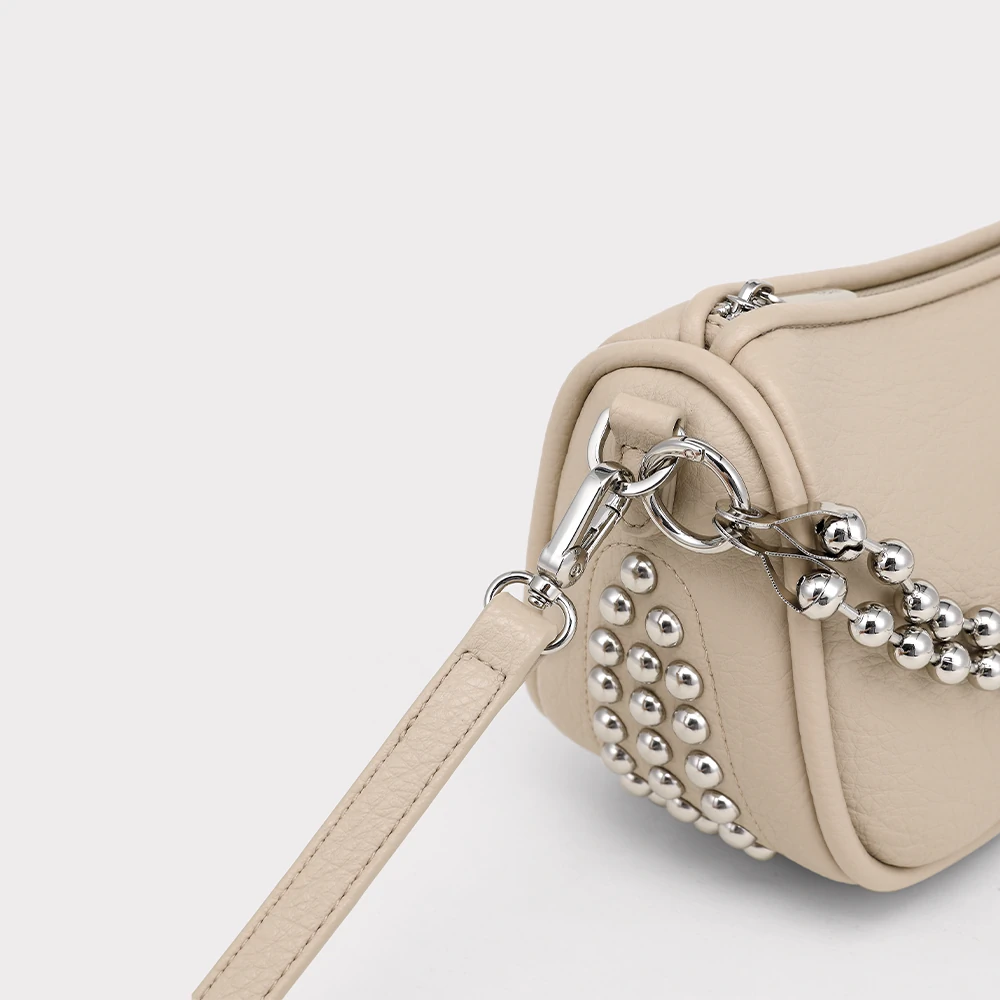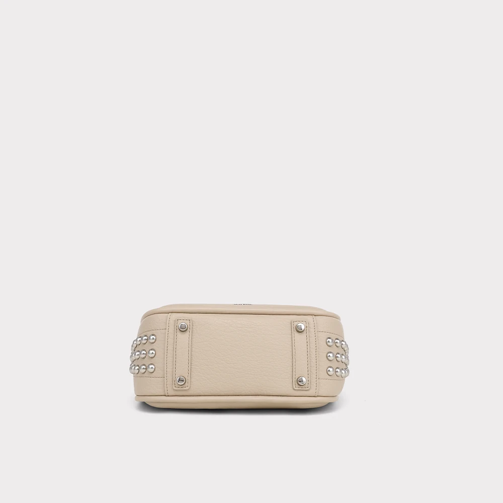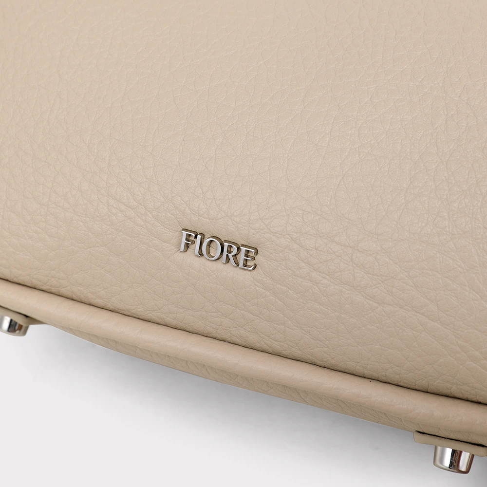 Bolsa transversal, detalhes na parte de baixo de studs, alça removível, alça de metal e logo Fiore frontal.