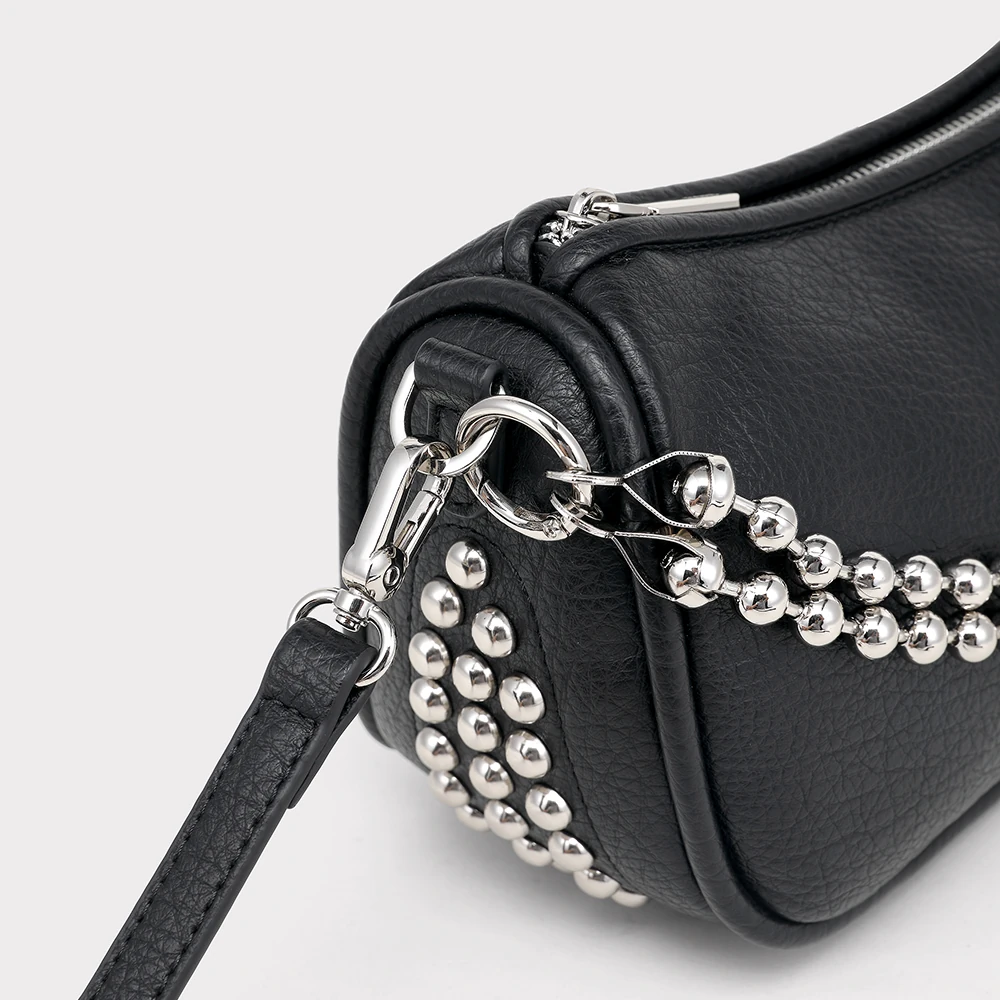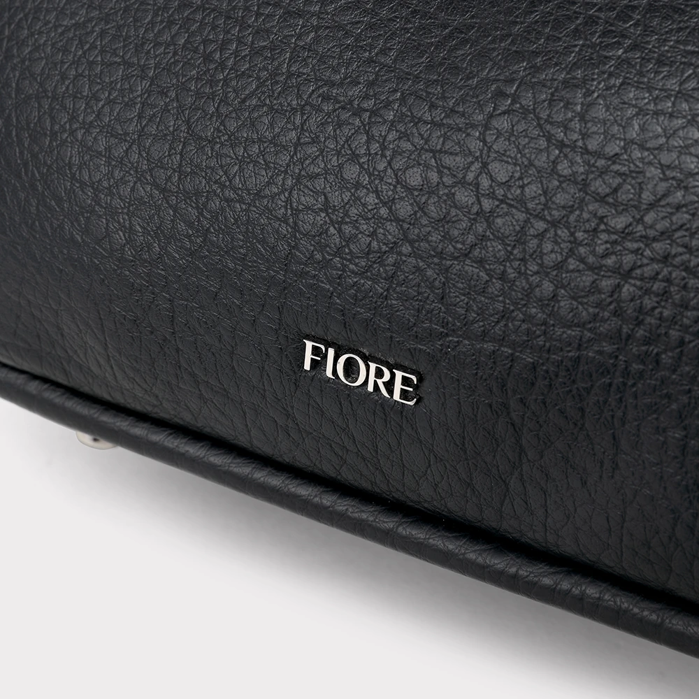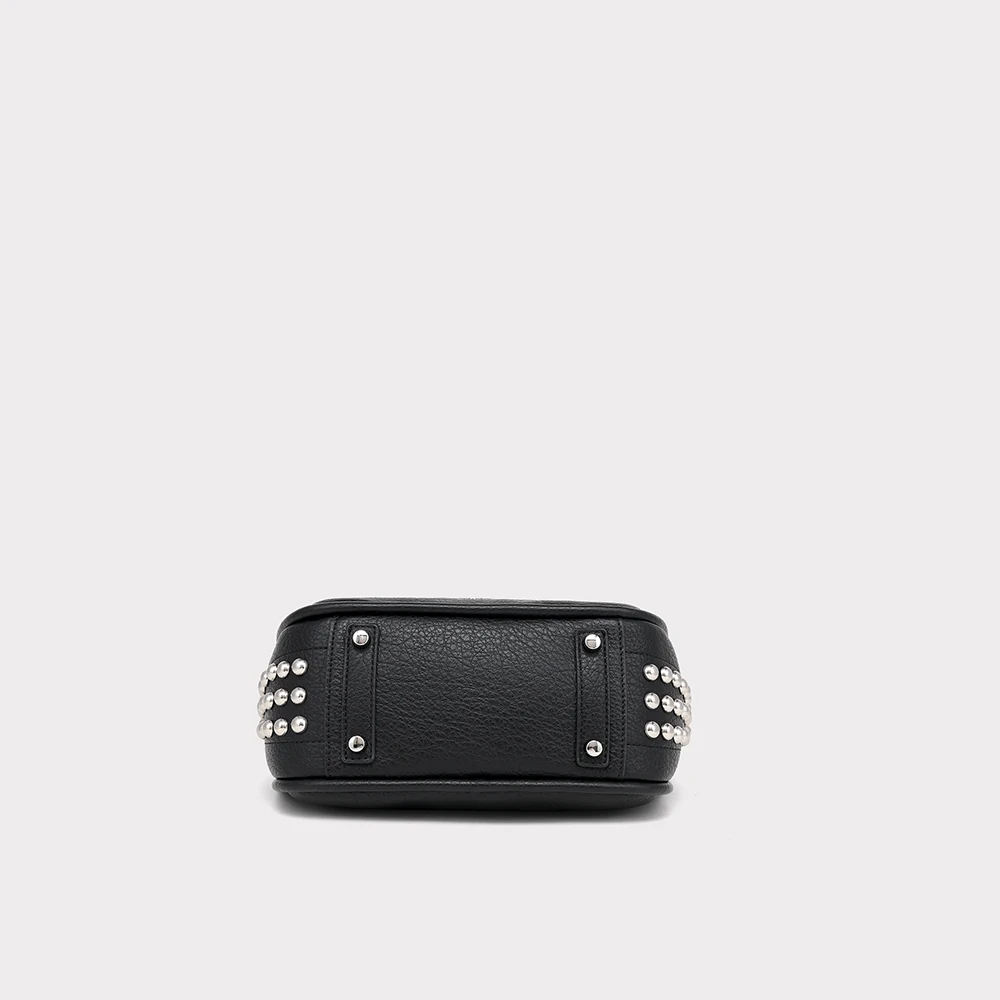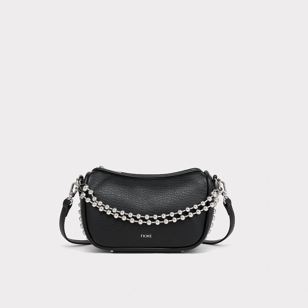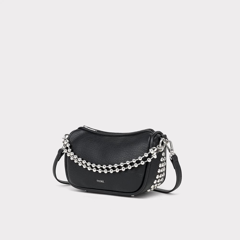 Bolsa transversal, detalhes na parte de baixo de studs, alça removível, alça de metal e logo Fiore frontal.