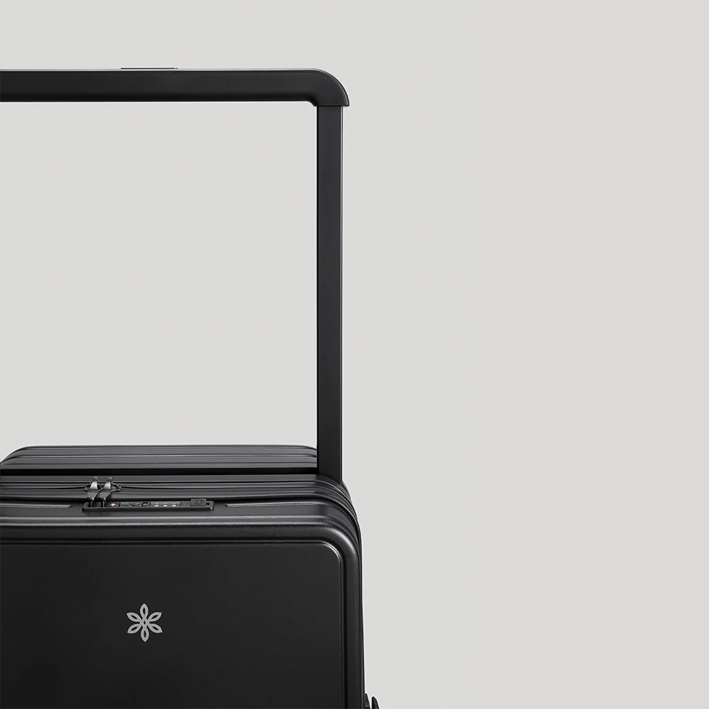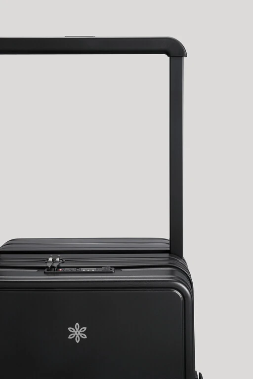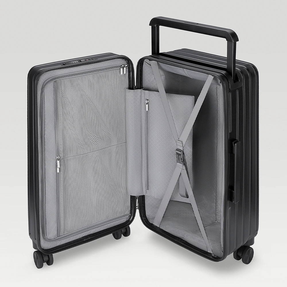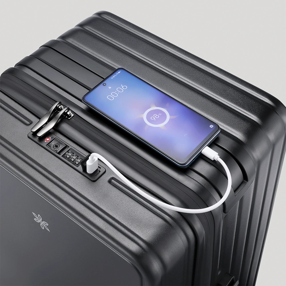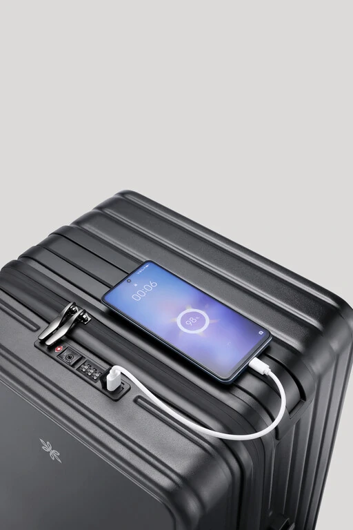 Mala média, contém carregador de celular e cadeado embutido, rodas 360º, alça de mão lateral, bolso interno pequeno e fechamento completo de uma de suas laterais, além de elástico para segurança dentro da mala.