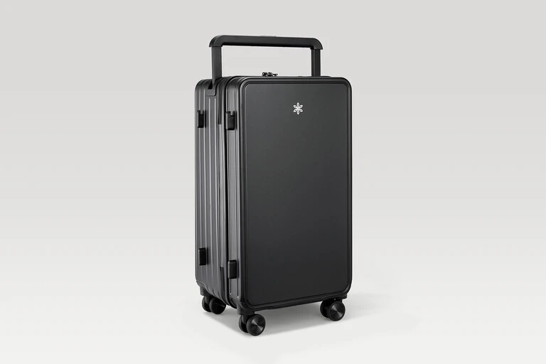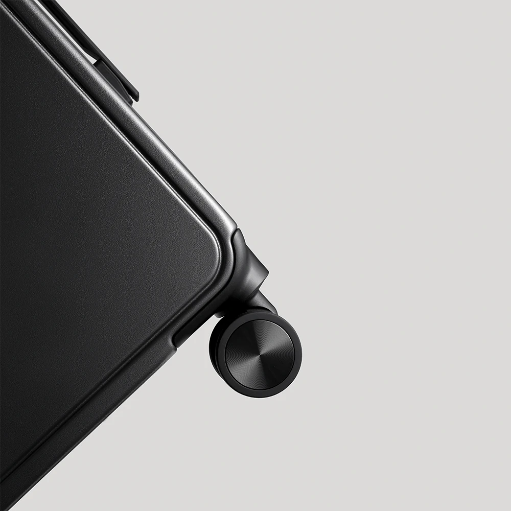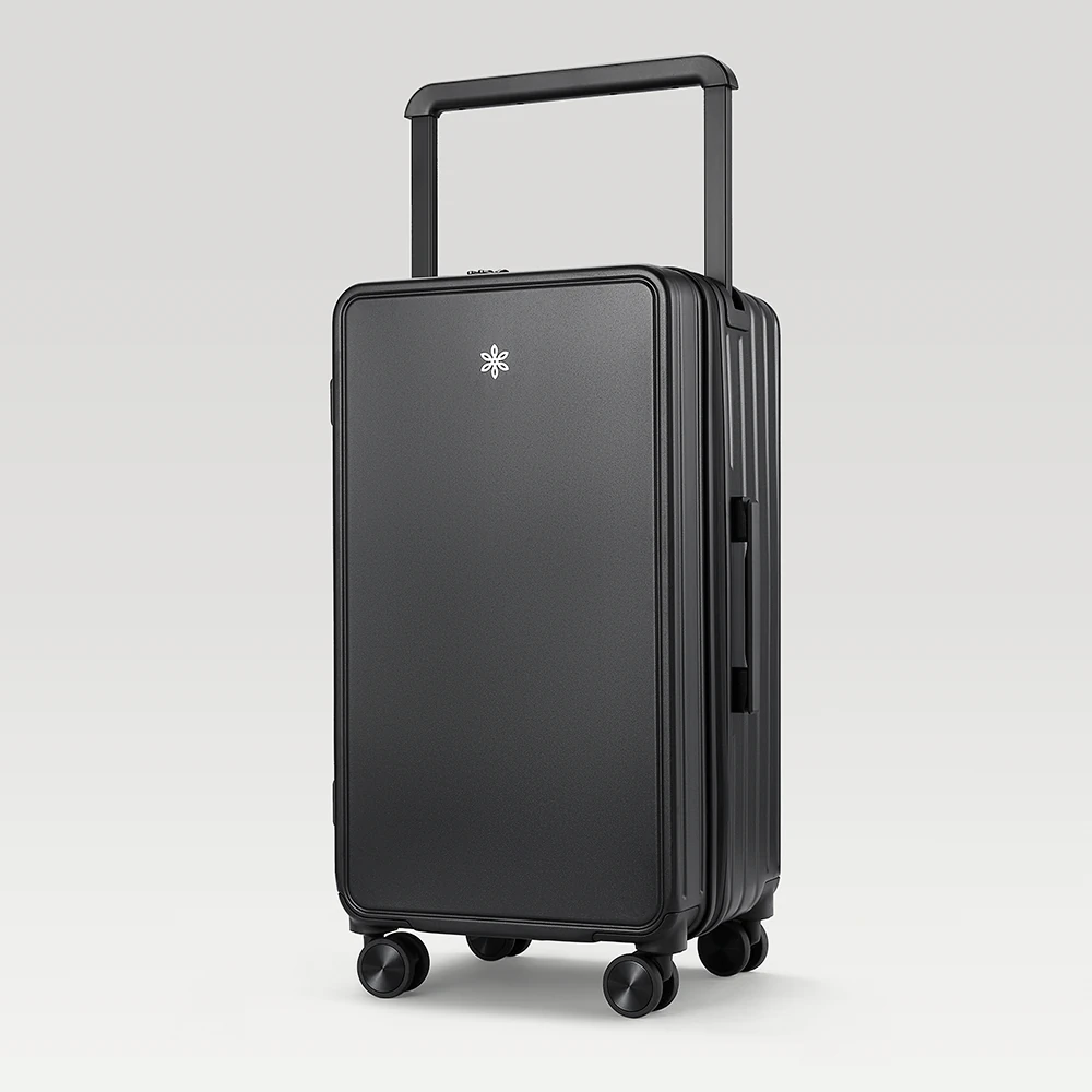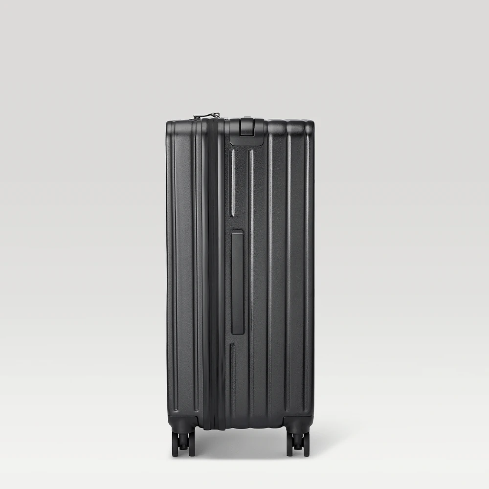 Mala média, contém carregador de celular e cadeado embutido, rodas 360º, alça de mão lateral, bolso interno pequeno e fechamento completo de uma de suas laterais, além de elástico para segurança dentro da mala.