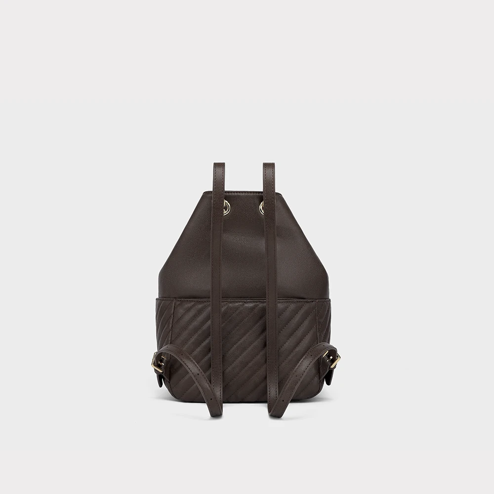 Mochila com design elegante e acabamento matelassê na parte frontal. Possui fechamento superior estilo saco, bolso frontal com aba e detalhes em corrente metálica dourada, que adicionam sofisticação ao visual. Versátil e funcional, é perfeita para o dia a dia, com alças ajustáveis e tom marrom fácil de combinar.