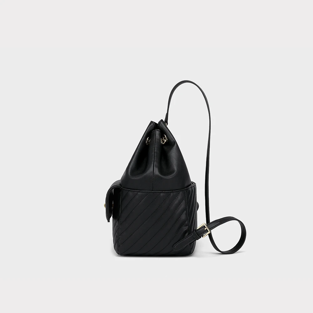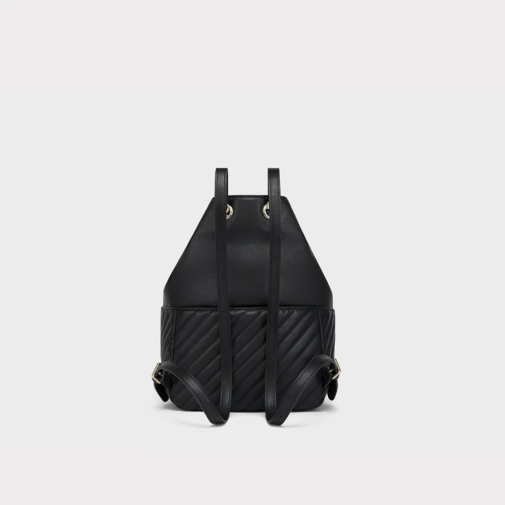 Mochila com design elegante e acabamento matelassê na parte frontal. Possui fechamento superior estilo saco, bolso frontal com aba e detalhes em corrente metálica dourada, que adicionam sofisticação ao visual. Versátil e funcional, é perfeita para o dia a dia, com alças ajustáveis e tom preto fácil de combinar.